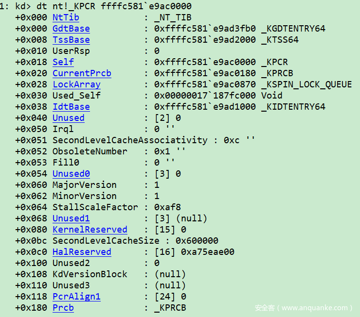 可能眼尖的朋友已经看到了,源码中取的gs:7000数据,这里的结构体才最多偏移0x180不够呀。其实最后一个KPRCB才是KPCR最重要的,它记录了相当多的数据。如下: