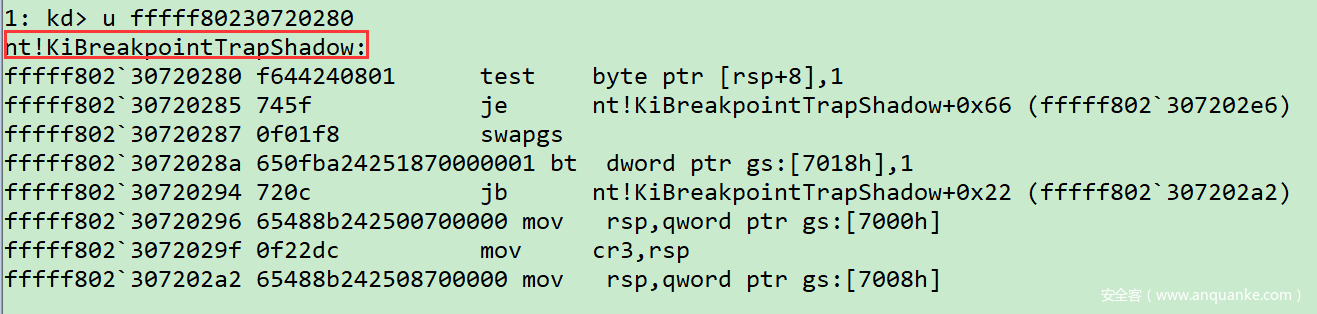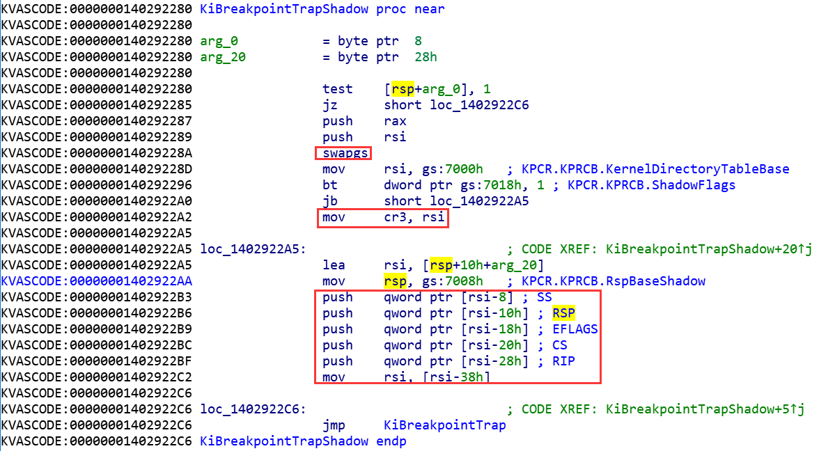 KVASCODE:00000001402922C6 loc_1402922C6: ; CODE XREF: KiBreakpointTrapShadow+5↑j
