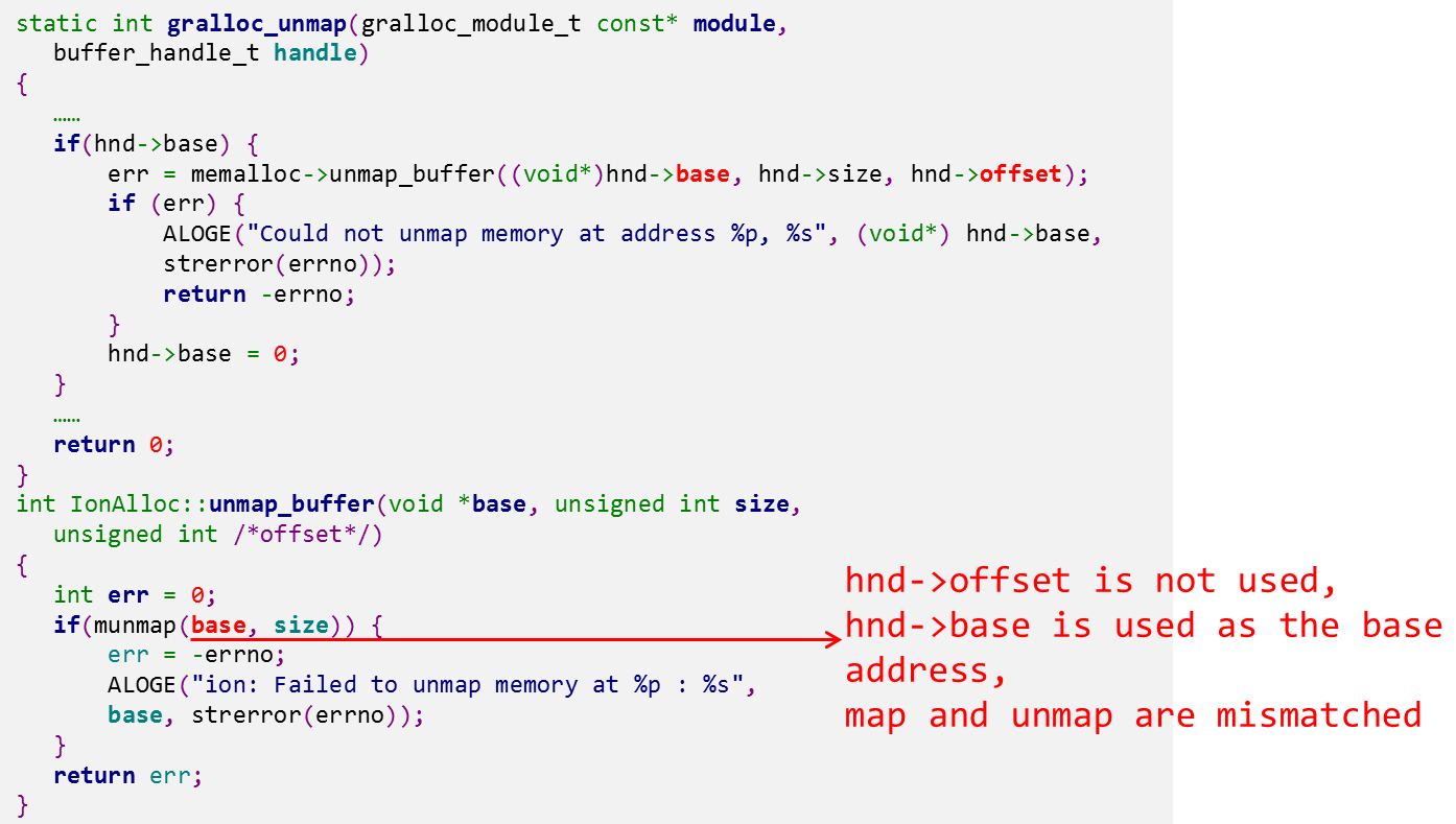 从代码中可以看出,hnd->base直接传入系统调用unmap,而没有减去hnd->offset,在该函数里,hnd->offset根本没有被使用,很显然,这将会导致map和unmap不匹配。