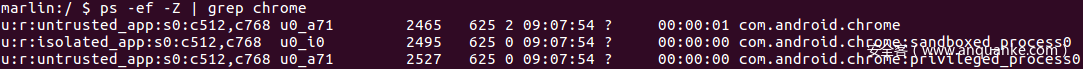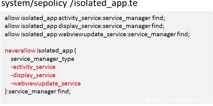 从上图可以看出Chrome是沙箱内进程,属于isolated_app 域。从下面isolated_app相应的sepolicy文件可以看出,从沙箱进程中,可以访问到一些服务,如activity_service。