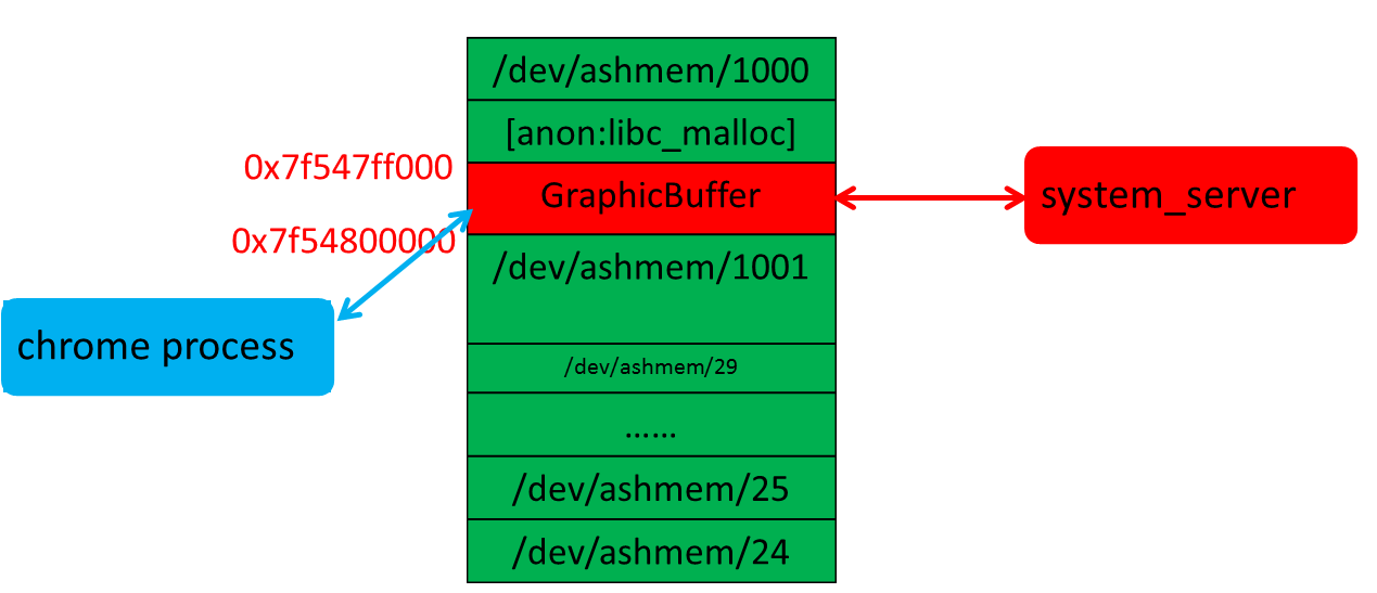 由于步骤三中填充的ashmem内存,同时被system_server和渲染进程map,因此system_server进程的部分堆空间可以被渲染进程读写,通过binder call,可以触发system_server在ashmem空间创建GraphicBuffer对象。