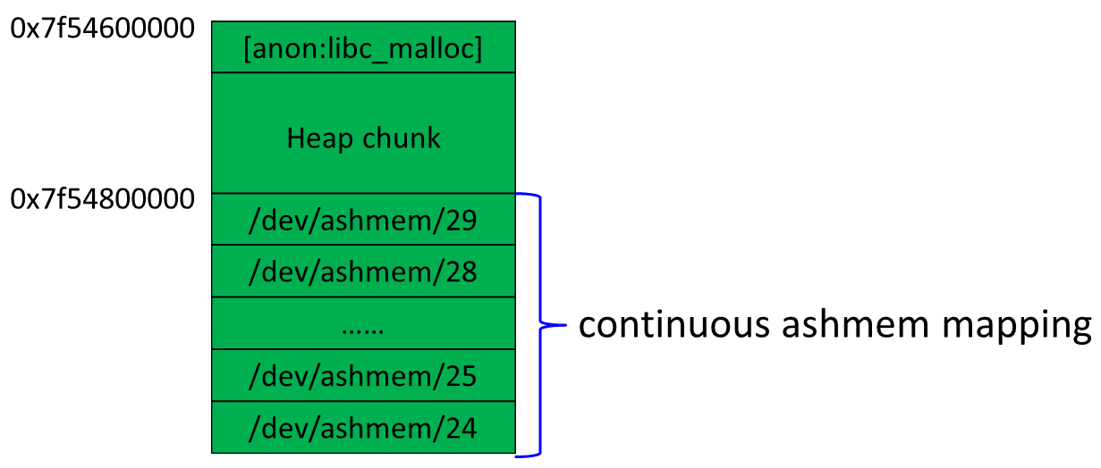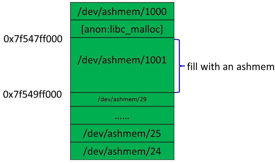 第一步,地址空间塑形,使一个堆块正好位于连续的ashmem映射空间之上,内存布局如下: