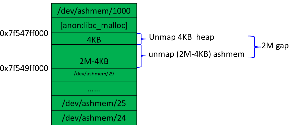 Unmap 4KB堆内存空间,(2M-4KB)的ashmem空间,因此在堆块和ashmem29之间形成2M的间隙。
