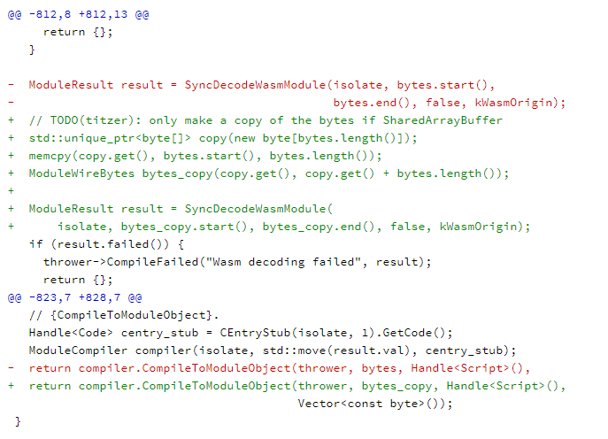 漏洞补丁,对WebAssembly代码进行了拷贝,这样在解析的时候,避免使用共享内存。