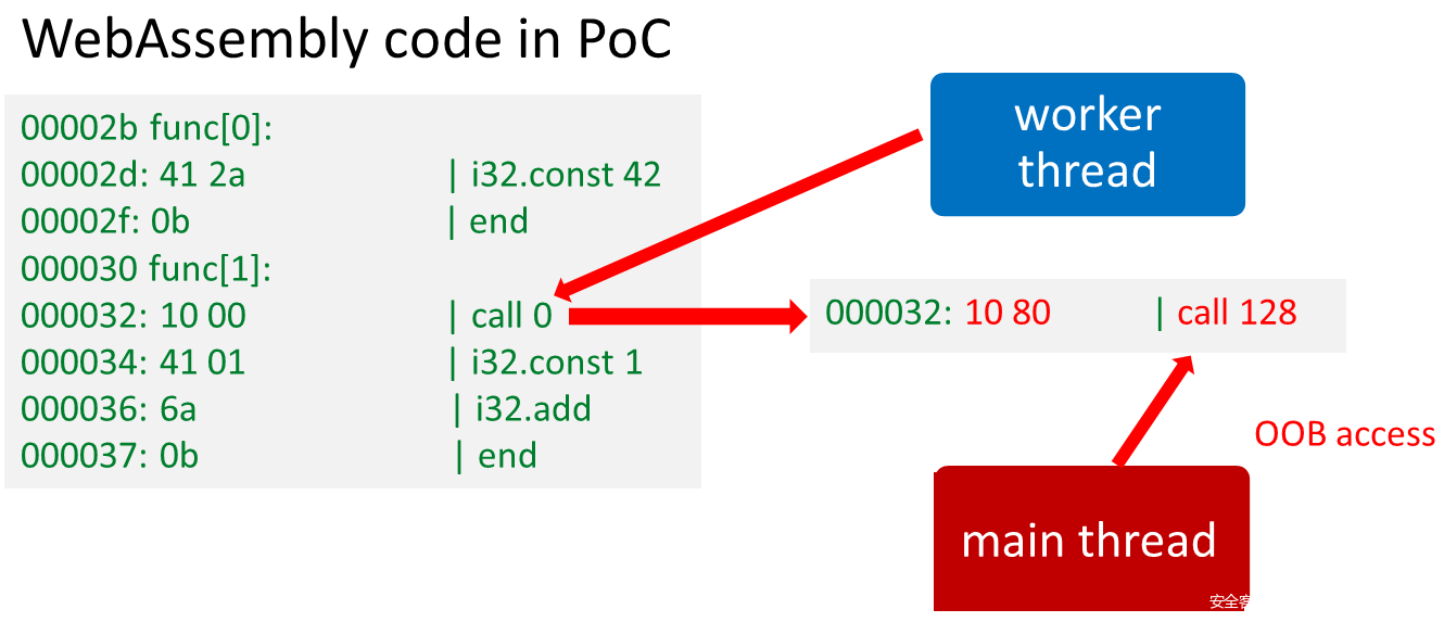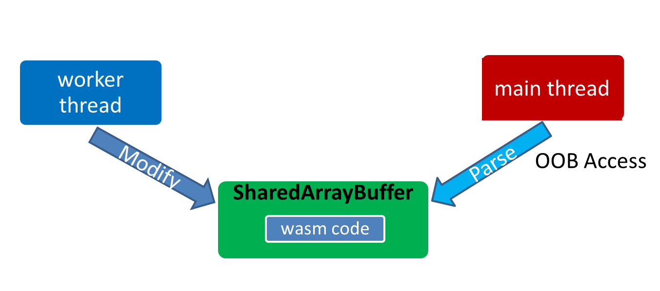 Worker线程将WebAssembly代码写入SharedArrayBuffer,然后传送给另一个web worker主线程,当主线程解析WebAssembly代码时,由于共享内存,worker线程此时可以修改此代码,从而造成越界访问问题。下面通过分析漏洞代码,来了解具体的细节。