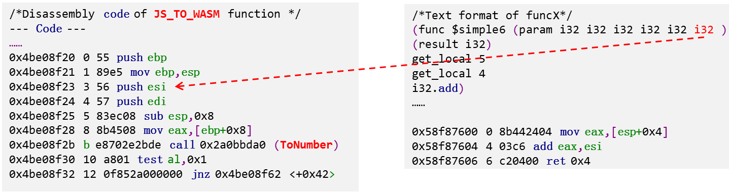 JS_TO_WASM 函数将funcX函数的第6个参数作为第1个参数,并且将参数作为对象指针,因此当参数传入ToNumber函数时,将会导致类型混淆。由于参数值可以通过JS设置,所以可以将任何值作为对象指针传给ToNumber。
