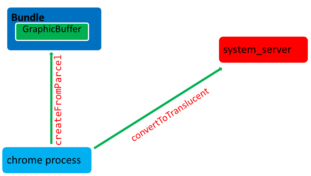到此,也就找到了一条从Chrome沙箱进程中访问system_server的通道。调用createFromParcel创建bundle,将bundle封装到GraphicBuffer,通过binder call方式调用convertToTranslucent方法,从而将恶意的bundle传入system_server。