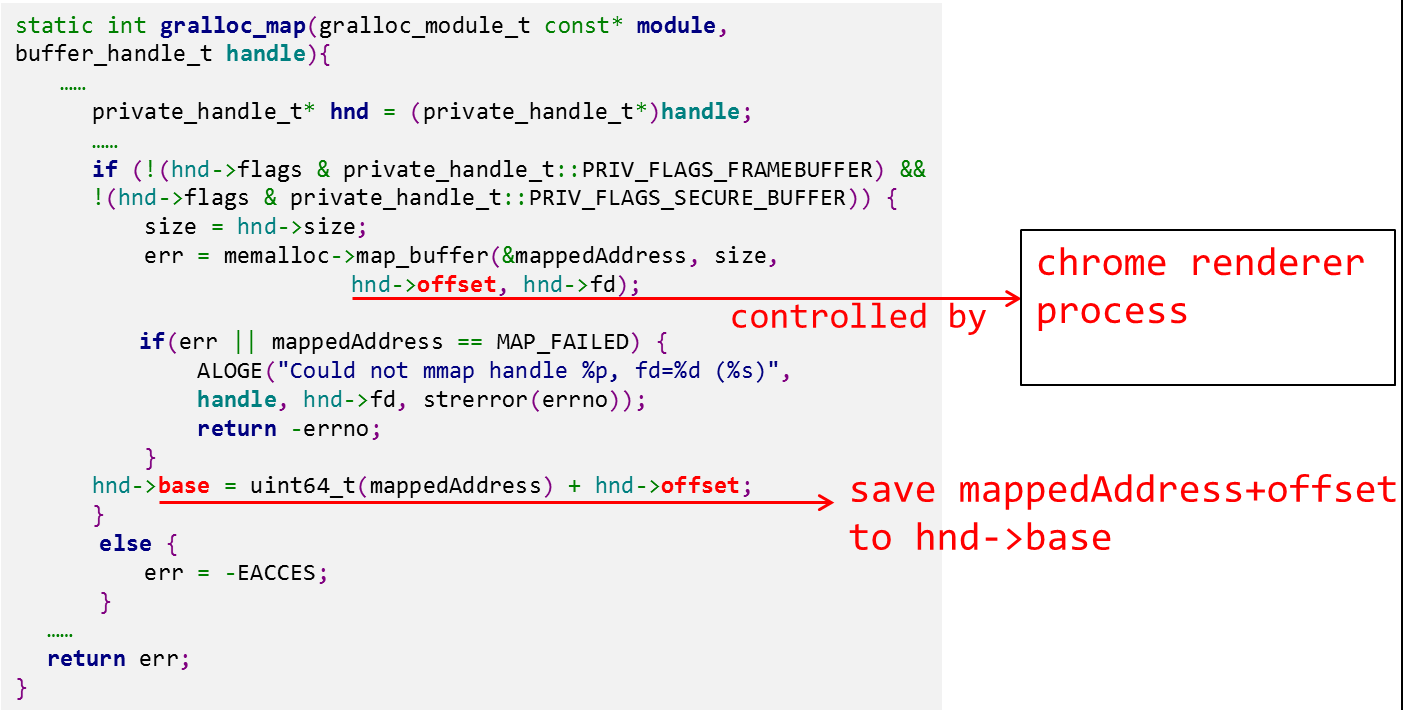 gralloc_map函数将graphic buffer映射到内存空间,graphic buffer 是由参数handle控制,而参数handle是由浏览器渲染进程控制。由于前面已经完成Chrome RCE,所以参数handle是可控的。