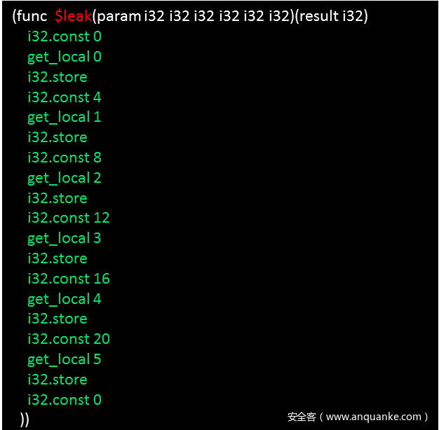 来看看另外一个线程,将WebAssembly写入SharedArrayBuffer,然后创建一个TypedArray数组sta,并且使用SharedArrayBuffer作为buffer。然后创建线程worker1,并且把SharedArrayBuffer传入worker1线程。当主线程在解析WebAssembly代码的时候,worker1线程修改了代码。worker1线程修改了什么代码?会造成什么影响呢?来看看PoC中WebAssembly code 的反汇编代码。