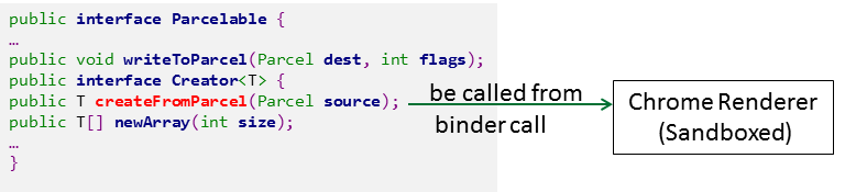 Android中很多类实现了接口Parcelable,他们的成员函数createFromParcel是可以被沙箱进程使用binder call 方式调用的,GraphicBuffer类就是其中之一。