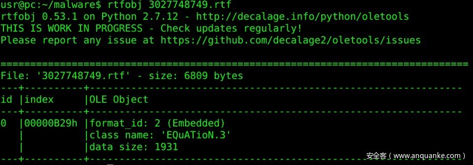 虽然RTF文件经过大量混淆,我们还是使用rtfdump以及rtfobj工具成功验证了文档结构,提取出实际的对象数据载荷。该文件尝试启动Microsoft公式编辑器(类名:EQuATioN.3),如图8所示。