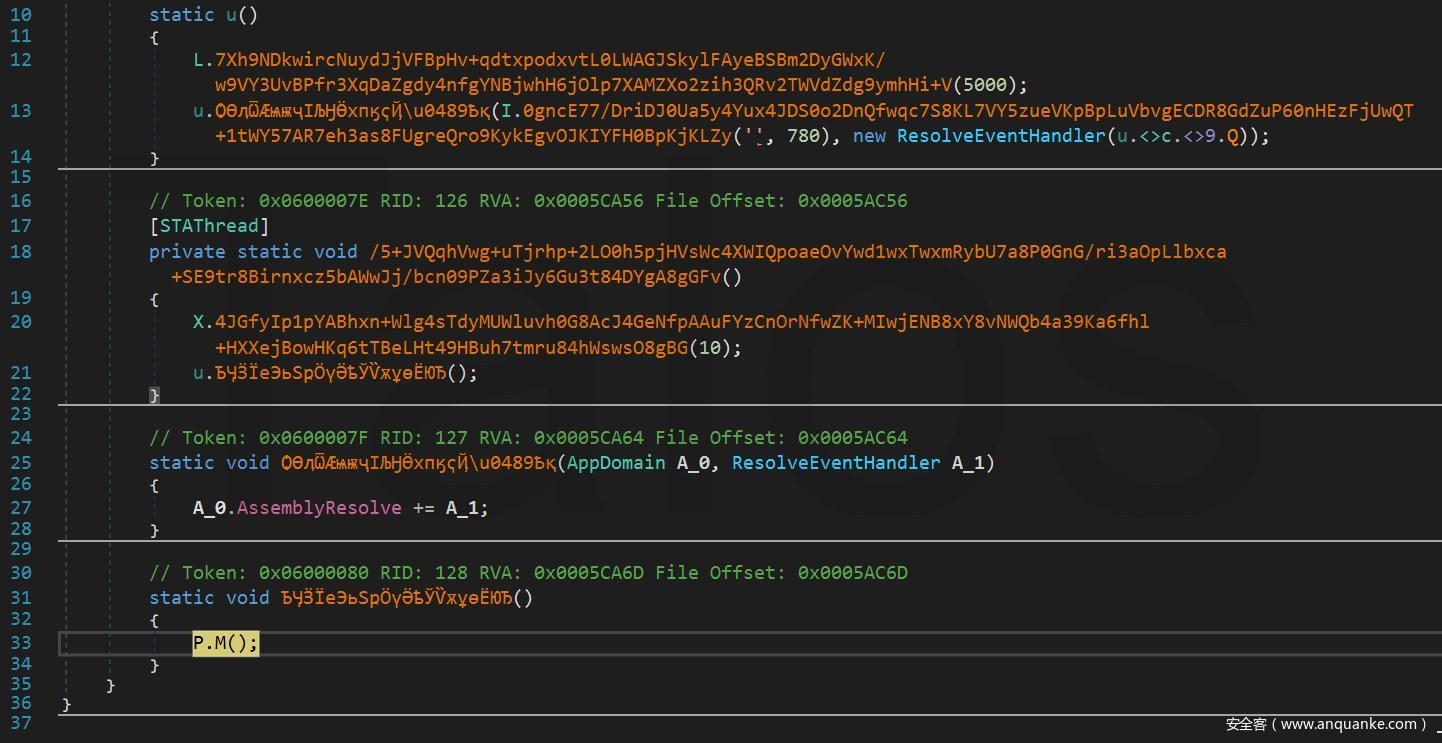 cctor还会从该数组中重构xs.dll以及其他代码,然后使用其他例程处理入口点。构造函数在最后会调用P.M()方法跳转到xs.dll中。