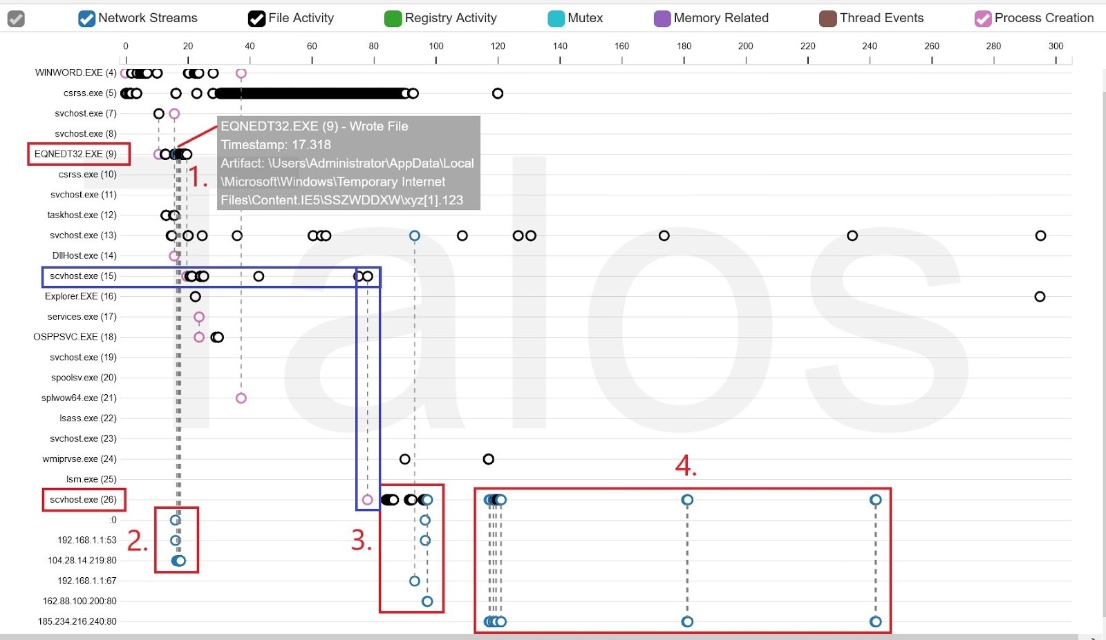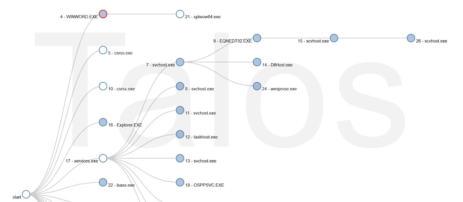 在图3中,我们可以看到Winword.exe进程启动,随后某个svchost进程执行微软公式编辑器(EQNEDT32.exe),后者启动了一个scvhost.exe。公式编辑器是Microsoft Office的一个辅助工具,可以用来将数学公式嵌入到文档中。在Word中,我们可以使用OLE或者COM函数来启动公式编辑器,这就是我们在上图中看到的进程。公式编辑器应用启动其他可执行文件(如图3中的其他程序)是非常罕见的情况,何况被启动的程序文件名本身就非常可疑(scvhost.exe)。注意该文件名,用户可能将其与svchost.exe混淆起来。