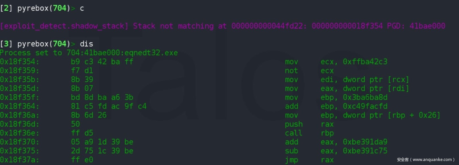 在本文分析中,我们使用了shadow stack插件,该插件于今年早些时候在EuskalHack Security Congress III上与其他漏洞利用分析脚本(shellcode检测和stack pivot检测)一同发布(演示文稿)。这个脚本可以监控指定进程(这里为公式编辑器进程)上下文中执行的所有调用以及RET指令,同时维护一个shadow stack,用来跟踪所有有效的返回地址(已执行的调用指令后的地址)。