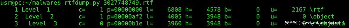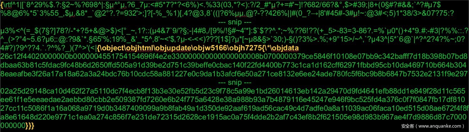 在图6中,我们可以看到攻击者使用了\objupdate技巧,这可以强制嵌入对象在显示前就进行更新。换句话说,用户不需要点击该对象就能完成对象加载,这对“普通”对象来说问题不大,但通过强制打开文件的方式,恶意软件就可以开启攻击过程。