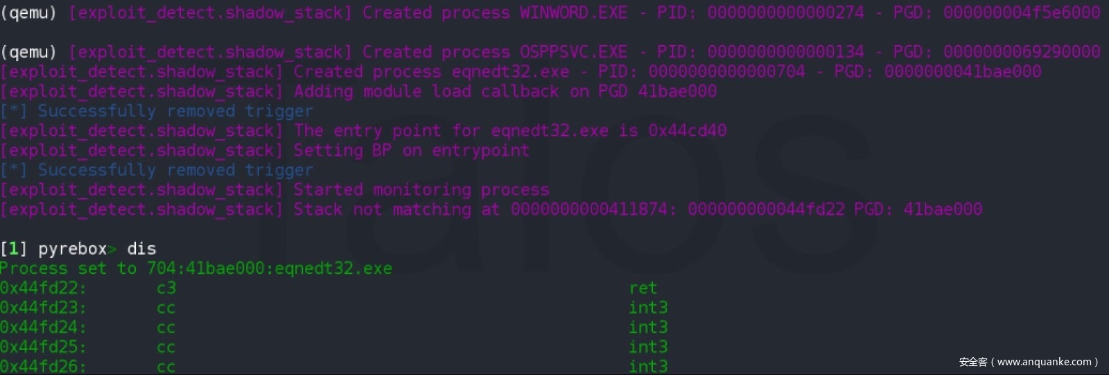 我们要做的唯一一件事就是配置插件来监控公式编辑器进程(插件会等待该进程执行),然后在模拟的环境中打开RTF文档即可。只要RET指令跳转到早于call指令的某个地址,PyREBox会停止系统执行。栈溢出漏洞利用会覆盖存在栈上的返回地址,这种方法可以让我们检测这类漏洞利用过程。一旦执行停止,PyREBox会生成一个交互式IPython shell,让我们检查系统,调试或者跟踪公式编辑器进程的执行状态。