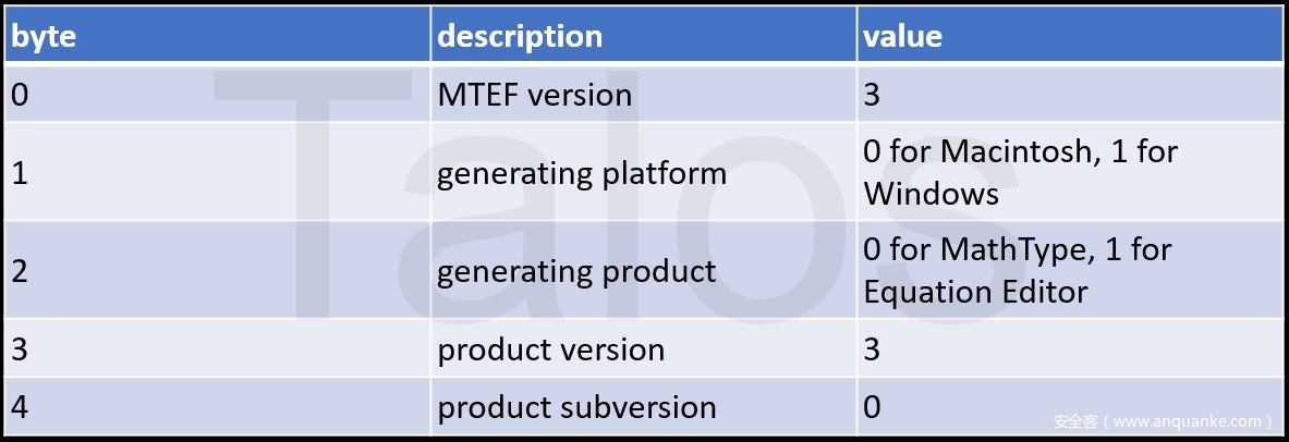 我们可以找到与之前FormBook分析文章中类似的MTEF头部数据,为了避免检测,攻击者修改了头部中的值。唯一的区别在于,除了MTEF版本号字段以外,攻击者往其他头部字段中填充了随机值。MTEF版本号字段的值需设置为2或者3,才能让漏洞利用成功。