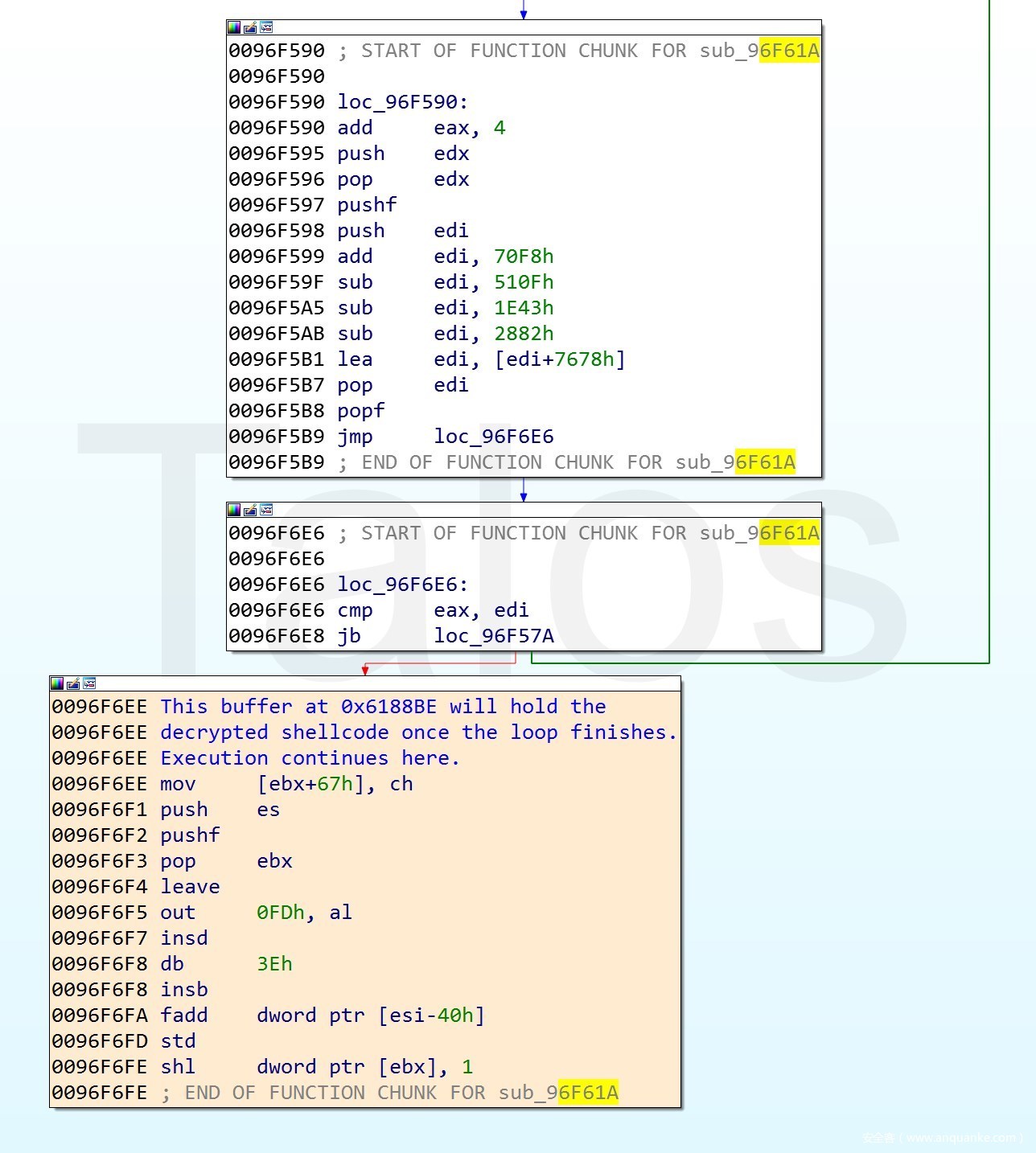 第二阶段shellcode由一系列jmp/call指令集合以及一个解密循环所组成。