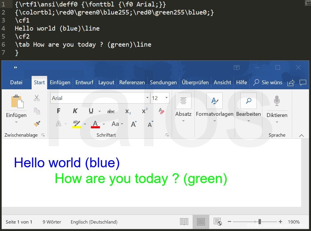 RTF标准是微软开发的专有文档文件格式,用于跨平台文档交换。举个例子,一个简单的RTF文件如图5所示,由文本以及控制字(control word,字符串)所组成。下图上半部分为源代码,下半部分为文件在Microsoft Word中的呈现效果。