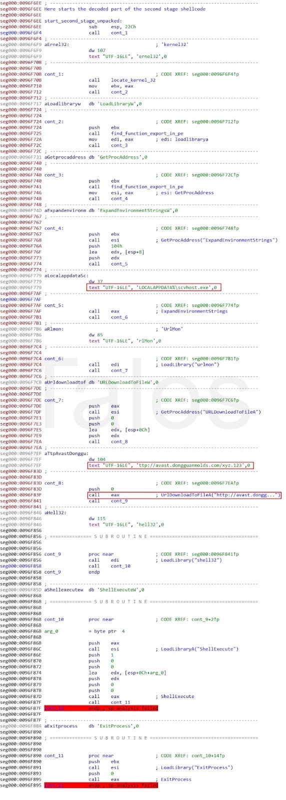 最后阶段shellcode的功能非常简单。载荷利用标准技术在PEB中可用的已加载模块链表中查找kernel32.dll模块,然后解析其导出表以便定位LoadLibrary以及GetProcAddress函数。利用这些函数,脚本可以解析出其他几个API函数(ExpandEnvironmentStrings、URLDownloadToFileA以及ShellExecute),从指定的URL处下载并执行xyz.123二进制文件(我们从Threat Grid的分析结果中看到过这个文件)。shellcode以scvhost.exe来运行这个可执行文件,在前面的Threat Grid报告中我们也能看到这个文件名。