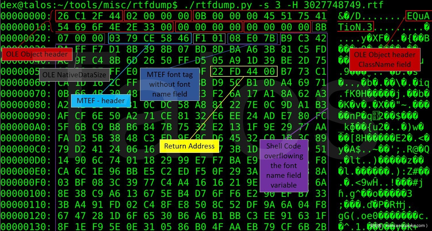 紧跟在MTEF头部后的是1个2字节的未知MTEF字节流标记(F1 01)以及字体标记(08 E0 7B ...)。字体标记后的数据(B9 C3 ...)看起来并不是正常的字体名称,所以这是一个非常明显的特征,表明我们面临的是一个漏洞利用样本。这段数据的确与我们之前研究的样本非常不同,但我们可以先解码出其中内容。