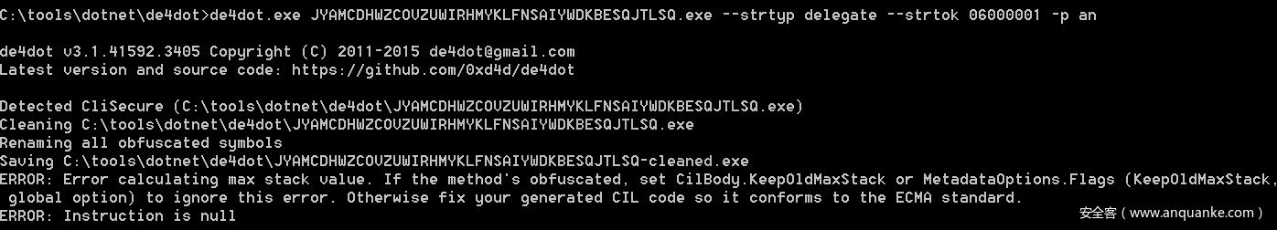 幸运的是,de4dot .NET去混淆工具只需要一条命令就能轻松解决这个问题。这里需输入样本在运行时使用哪个方法来解密字符串,具体方法是输入解密方法对应的令牌(本例中为0x06000001)。由于De4dot在自动检测Agile .NET混淆器方面有点问题,因此我们需要使用-p参数手动传入该信息。