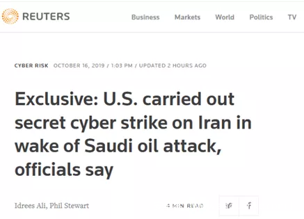 果然,就在10月16日也就是今天,路透社援引两名美国官员的话爆料证实:在9月14日对沙特阿拉伯石油设施的袭击之后,美国对伊朗进行了秘密网络攻击。