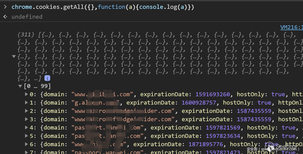 当申请这样的权限之后,我们可以通过调用chrome.cookies去获取google.com域下的所有cookie.