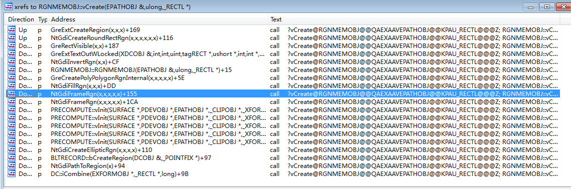 接下去要做的就是成功调用存在漏洞的函数。查看调用RGNMEMOBJ::vCreate的函数,可以选择的函数非常的多,在尝试了FillRgn,CreateEllipticRgn等函数后发现可以触发RGNMEMOBJ::vCreate函数的调用,但是却无法执行到申请内存处的代码。