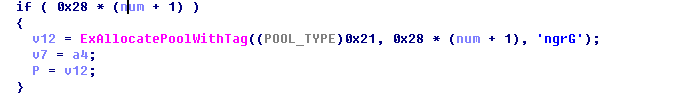如果之前有分析过windows内核整型溢出漏洞的应该会知道ULongAdd和ULongLongToULong这两个函数是用来防止整型溢出的。因此可以判定这也是一个申请内存时发生的整型上溢漏洞。