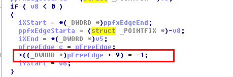 这里有一点非常重要的是相邻两个点的纵坐标y值不能相同,如果相同会直接返回,而不会将EDGE结构拷贝到申请的内存中。就无法造成堆溢出。但是如果所有相邻的两个点纵坐标y值都不相同,又会导致大量的页面被破坏,因此必须仅让部分相邻点纵坐标不同,仅覆盖想要覆盖的值,尽可能的少破坏内存页。