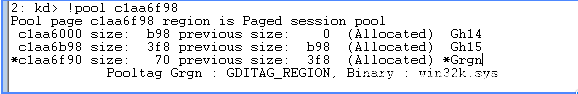 在RGNMEMOBJ::vCreate函数结尾对之前申请的空间进行了释放。所以我们希望我们这70Bytes能分配到某一页的末尾。因为操作系统在释放分配的对象时,会校验相邻对象的POOL_HEADER结构,如果发现该结构被破坏就会引发系统崩溃,如果被释放的对象在某一页的末尾,操作系统就不会执行校验操作。