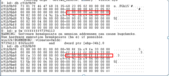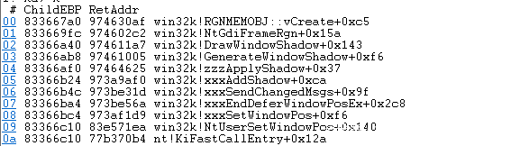 只好在RGNMEMOBJ::vCreate中调用ExAllocatePoolWithTag处下断点,观察正常使用系统时什么函数可以到达该处。发现FrameRgn可以成功到达漏洞触发点。但是新的问题又出现了,无法精确的控制申请内存的大小。
