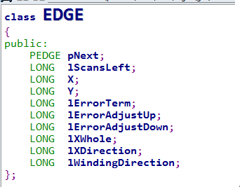 AddEdgeToGET函数会将相邻的两个点(就是前文提到的PolyLineTo函数的POINT数组)转化为一个EDGE结构,并将该EDGE结构依次拷贝到之前申请的内存中,最后一个点会与系统添加的坐标为(0,0)转化为一个EDGE结构。