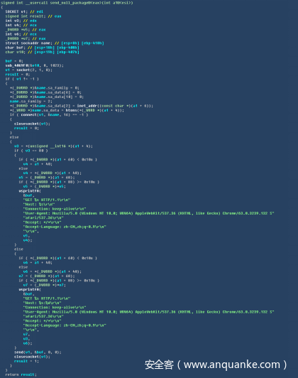 QQExternal.exe会再%windir%Temp目录下释放出随机名(如:ddxiwuk.dat)驱动文件进行加载,该驱动会最终释放DDoS攻击病毒。DDos病毒首先会先从C&C服务器地址(hxxp:// www.hn45678.com)请求攻击数据,之后对指定地址进行DDoS攻击。相关代码,如下图所示: