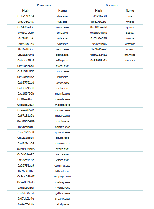 为了找出该木马列表中包含的进程和服务,我们从木马中获得了哈希值,并得到了部分结果,如下所示: