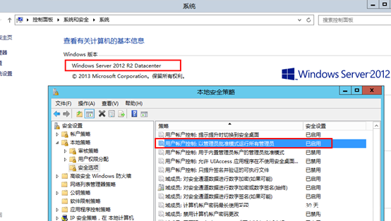 在WindowsServer 2012 R2版本服务器中可以看到本地安全策略中的“用户帐户控制:以管理员批准模式运行所有的管理员”确实是默认开启的。