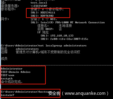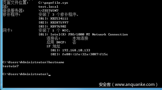 首先看一下未安装补丁的情况,其中本地管理员组有三个帐户,主机名为TESTWIN7,所在域为TEST.LOCAL: