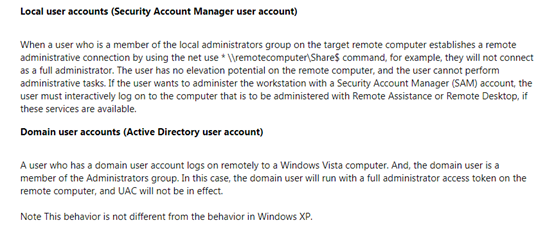 根据微软官方关于远程访问和用户帐户控制的相关文档可以了解到,UAC为了更好的保护Administrators组的帐户,会在网络上进行限制。https://support.microsoft.com/en-us/help/951016/description-of-user-account-control-and-remote-restrictions-in-windows