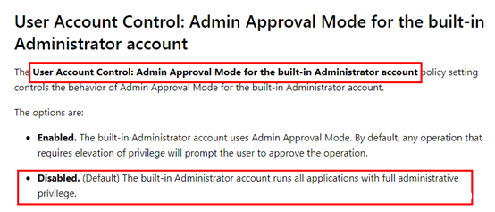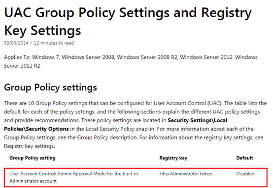 在UAC组策略设置和注册表项设置的官方文档(https://docs.microsoft.com/en-us/previous-versions/windows/it-pro/windows-server-2008-R2-and-2008/dd835564(v=ws.10)#BKMK_BuiltInAdmin)中可以看到相关的描述,关于UAC的注册表中一个注册表键值为FilterAdministratorToken,且在Windows Server 2008默认为Disable。
