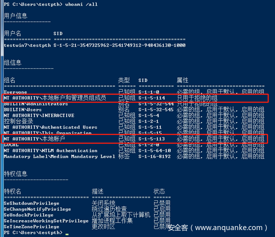注意:S-1-5-114这里在中文操作系统中提供的翻译是“NT AUTHORITY\本地帐户和管理员组成员”,但实际上是“所有本地Administrators组中的本地帐户”,即域用户即使被加入到了本地Administrators组也不继承此SID。