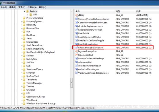 那如何限制administrator的远程登录呢?那就是直接把FilterAdministratorToken开启就可以了。现在将testwin7主机的FilterAdministratorToken设置为1。