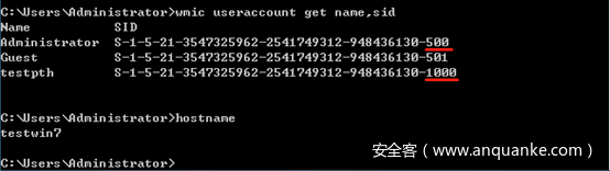 图中可以看到在Windows中administrator的RID为500,并且是唯一的。同样为管理员组的本地帐户的testpth的RID的值为1000。