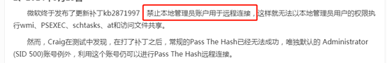 这里可以看到在安装KB2871997前后的对比发现并没有任何区别。而之前非administrator的本地管理员Pass The Hash失败被认为是KB2871997的作用,实际是由于远程访问和UAC的限制。