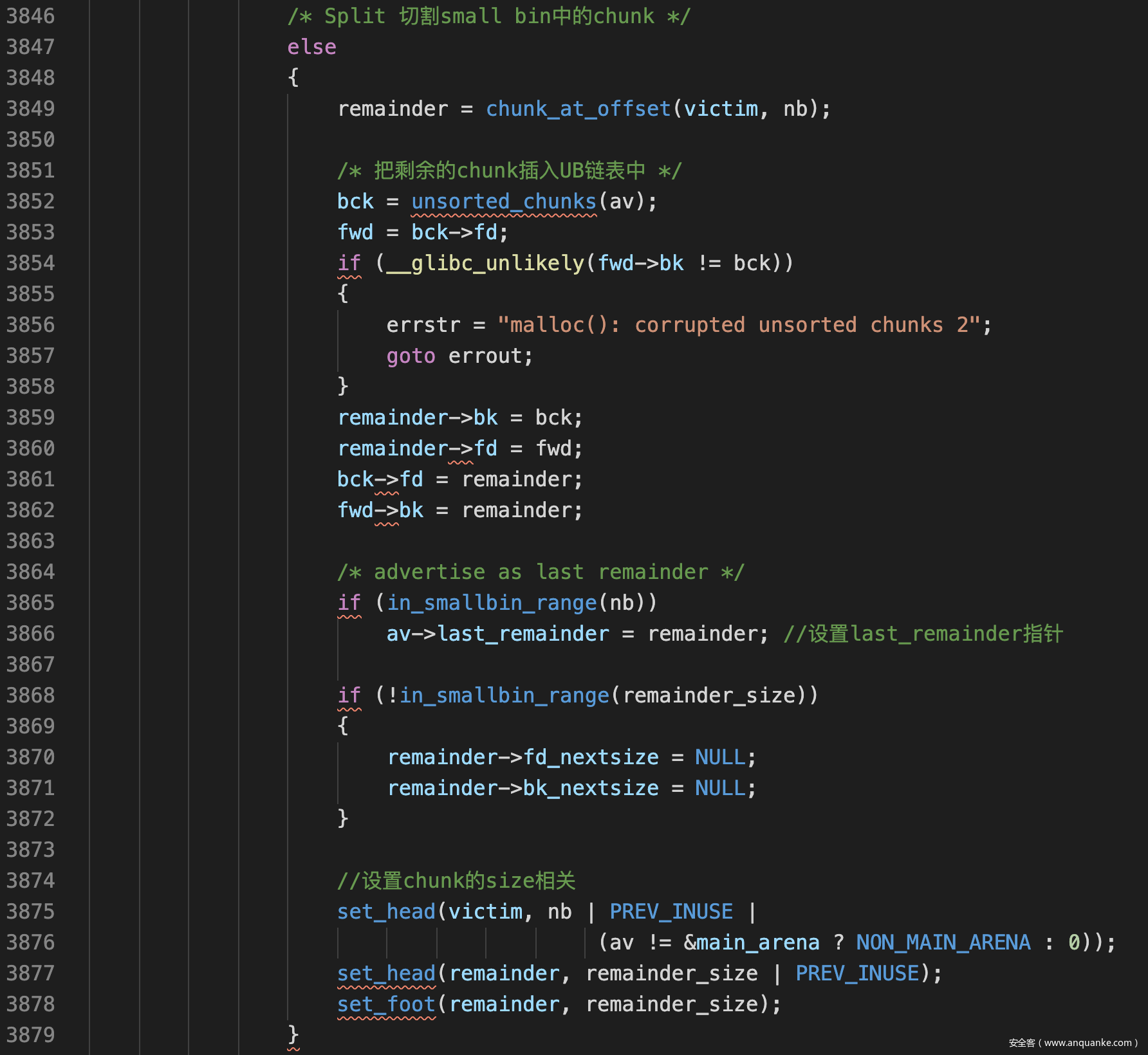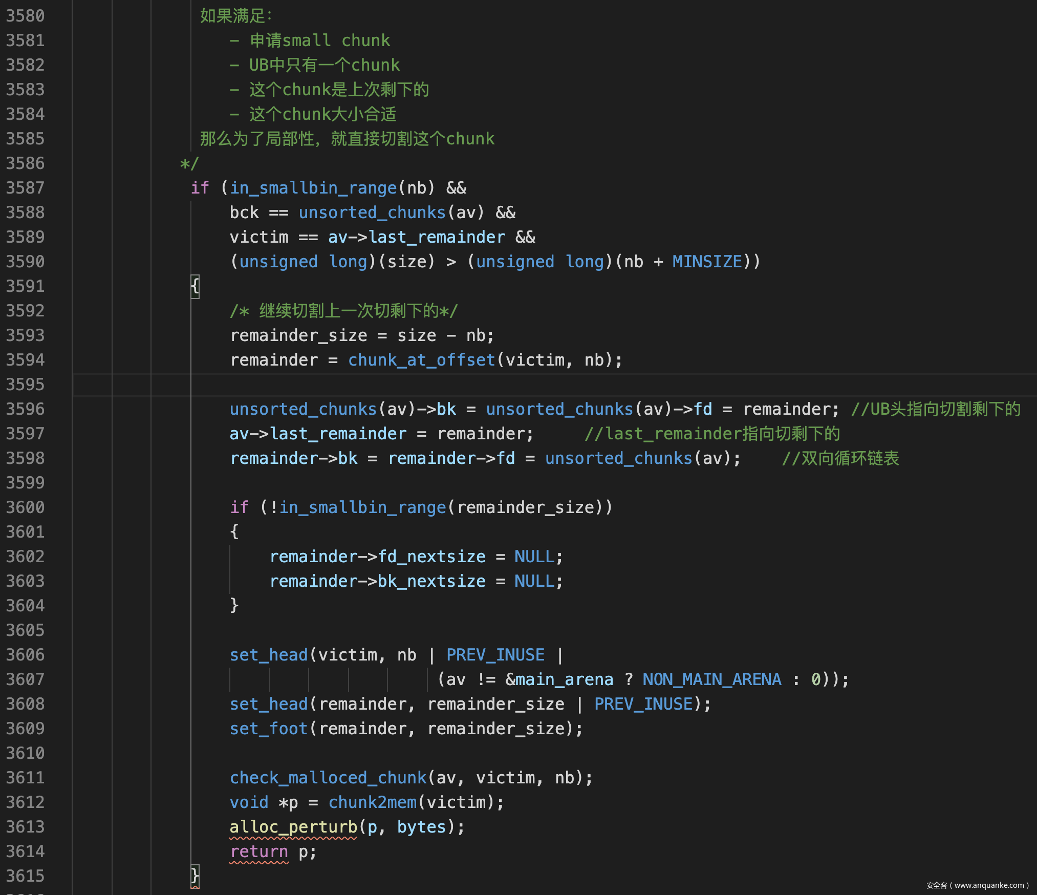 在遍历UB时,av->last_remainder指向被切割剩下的chunk,用于局部性优化,尽量让malloc到的内存地址相邻