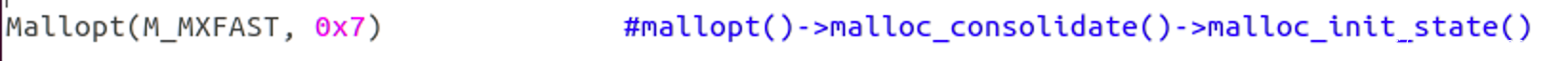 Mallopt(M_MXFAST, 0x7) #mallopt()->malloc_consolidate()->malloc_init_state()