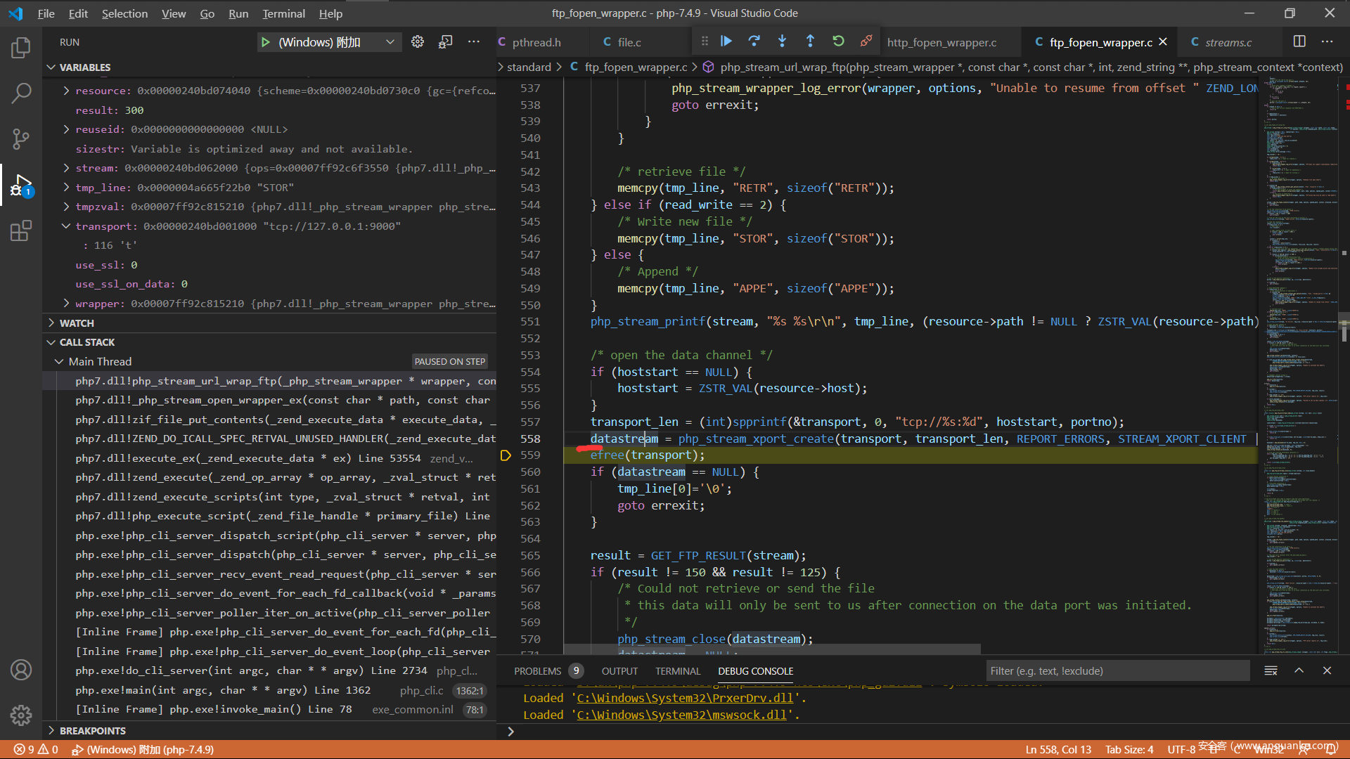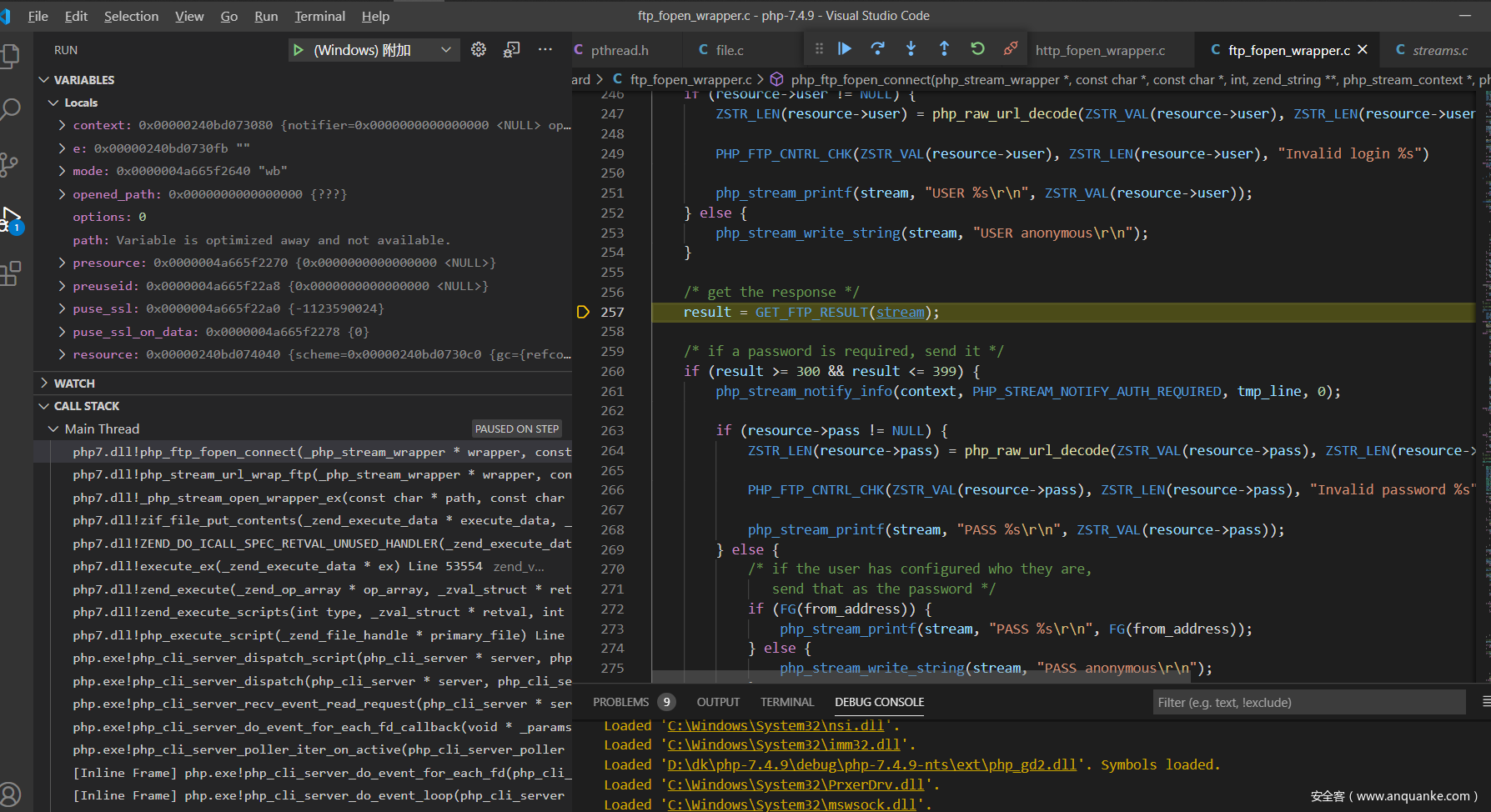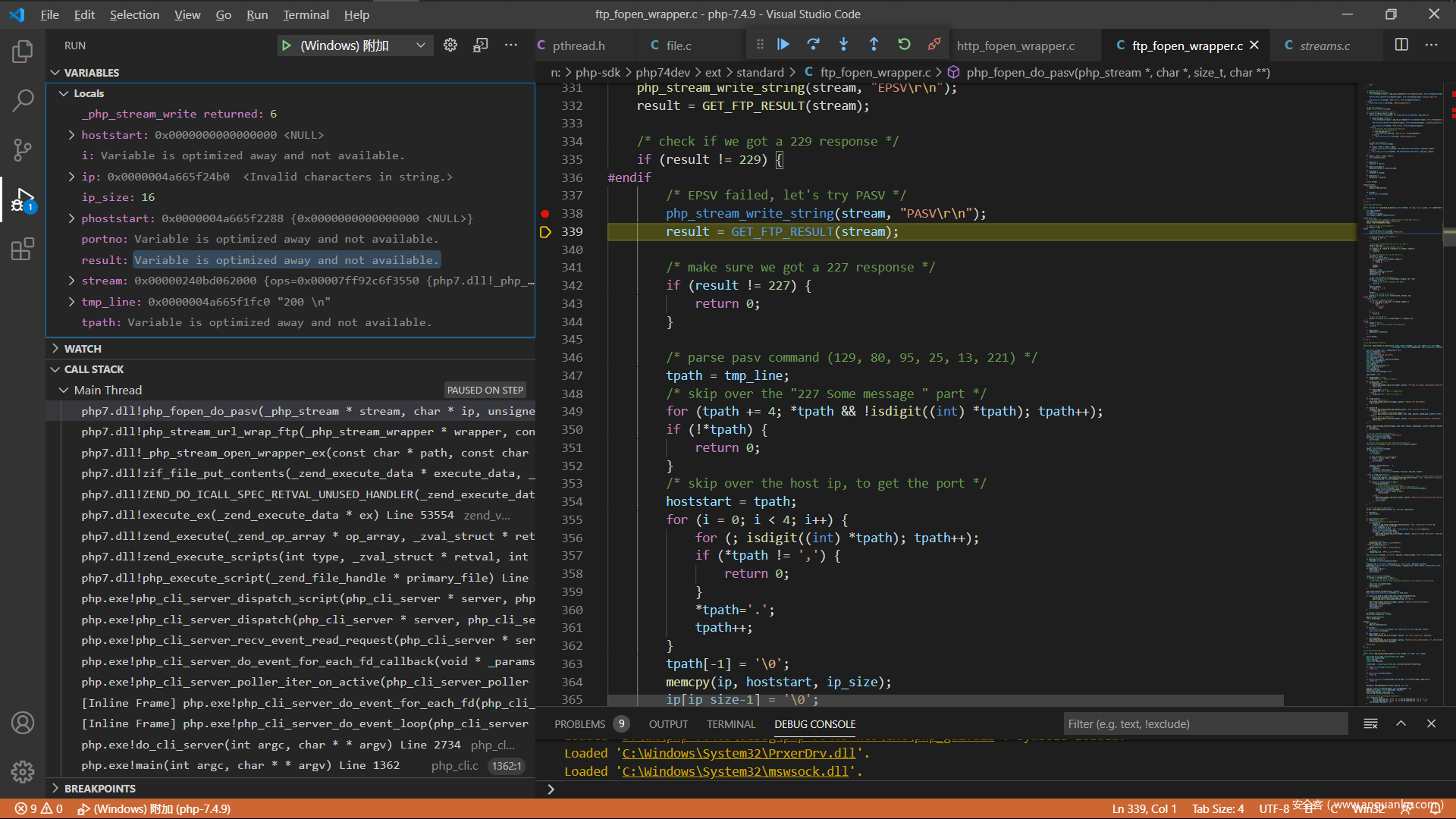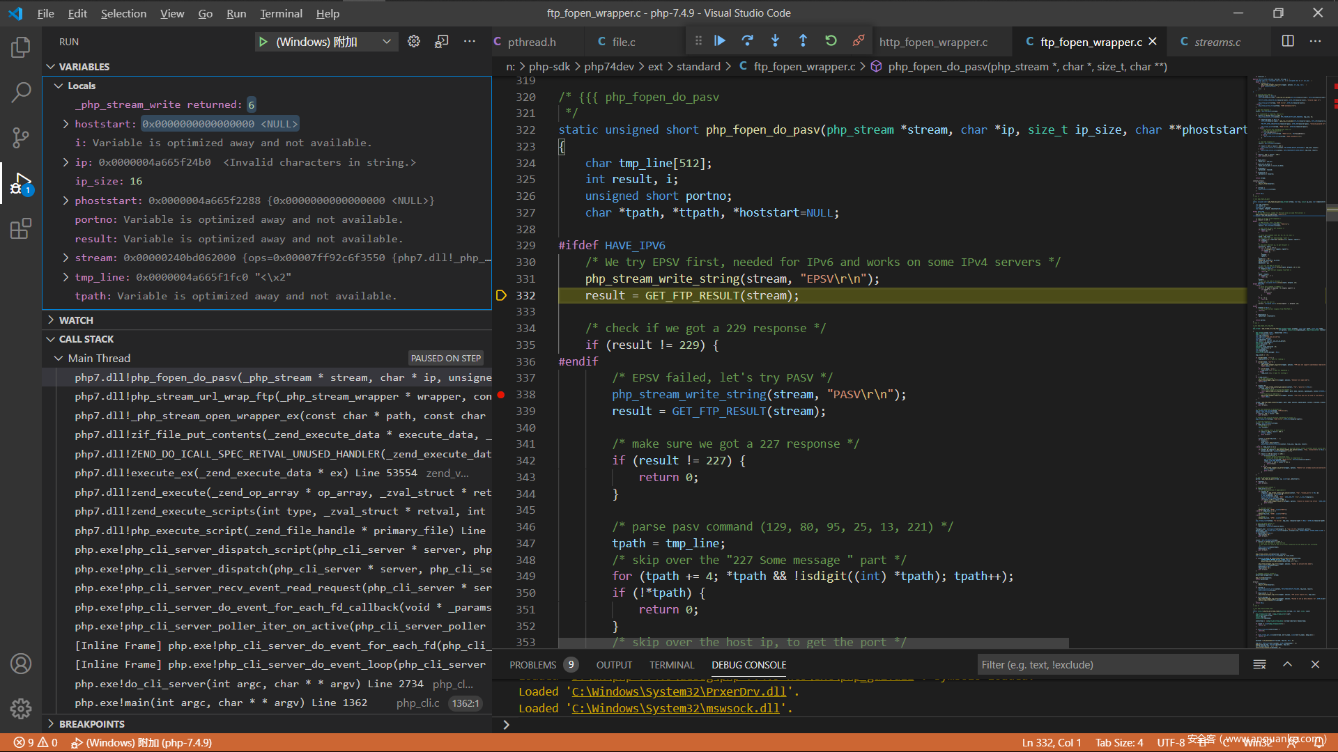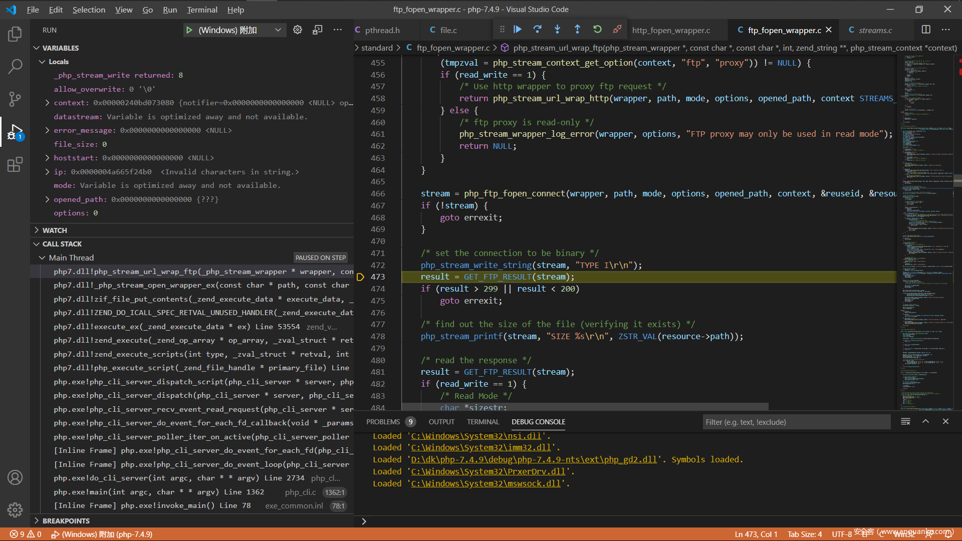 现在来分析一下php的源码吧,调试php的c源码这个应该都没有问题,直接从ftp协议解析的地方开始,我选择的是在window下面附加到php的http服务,下面是index.php的代码