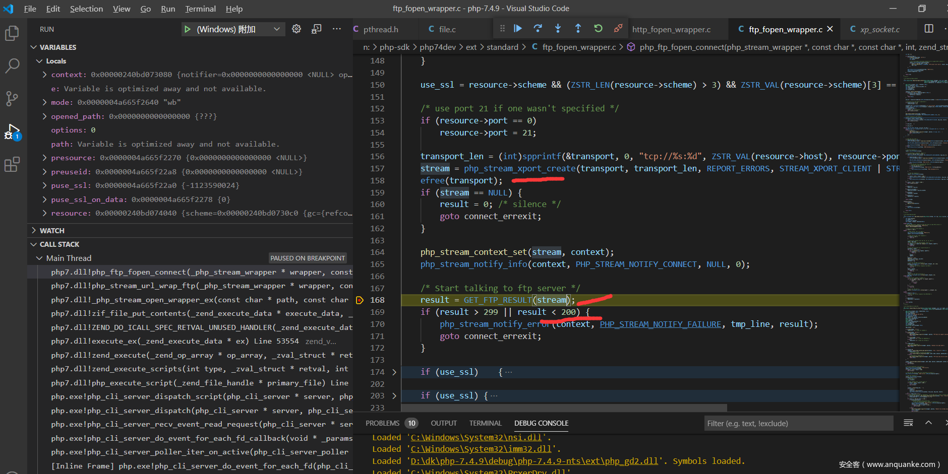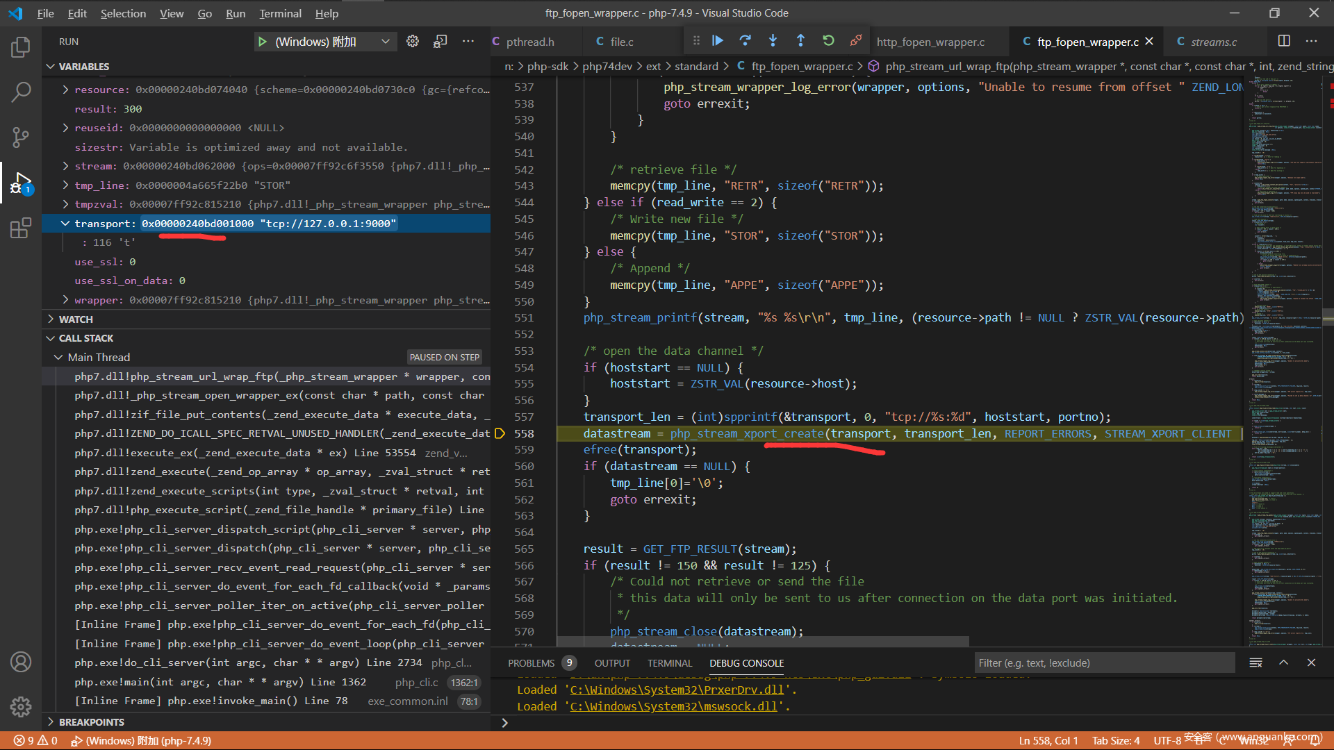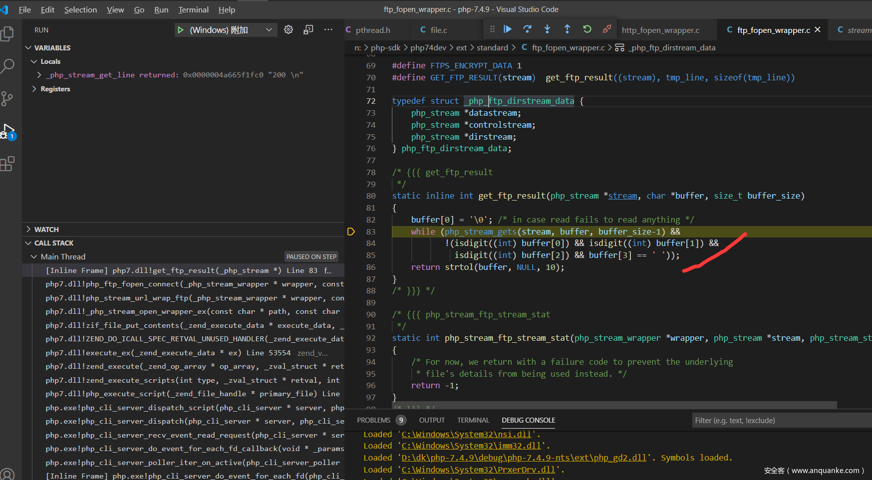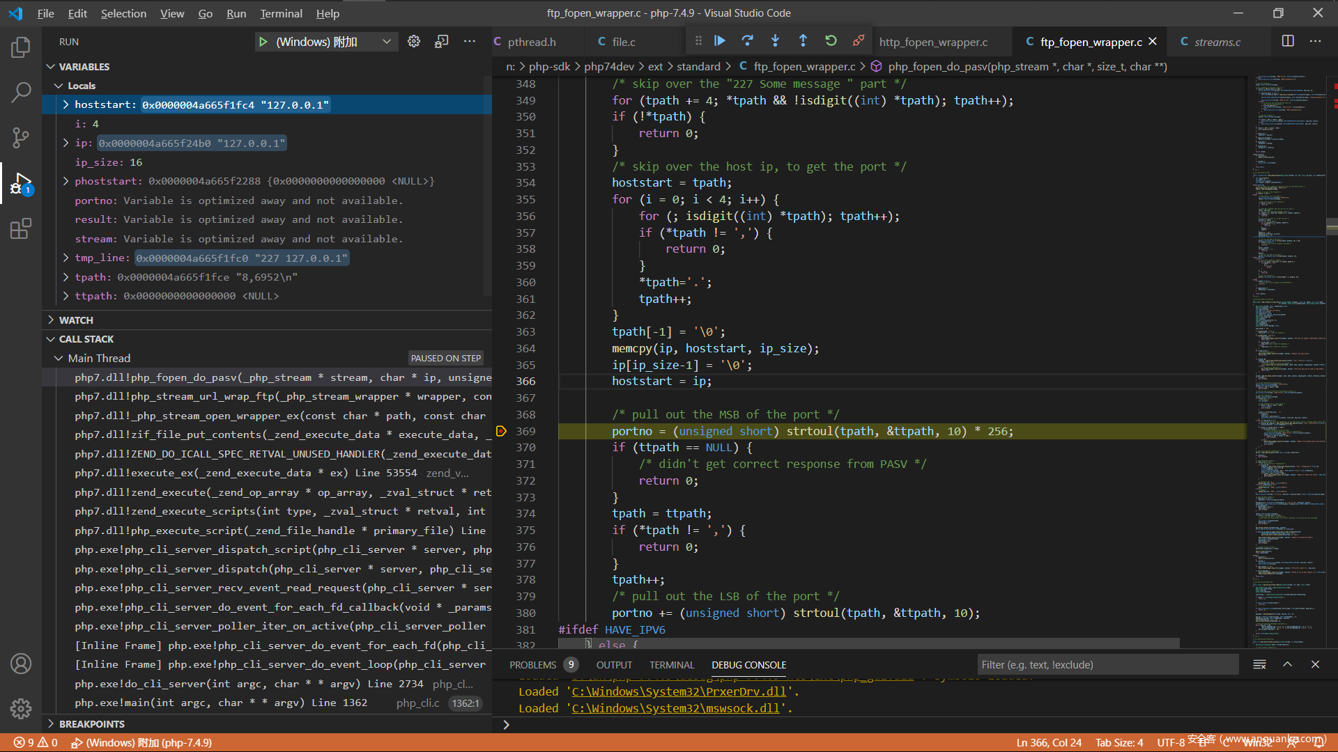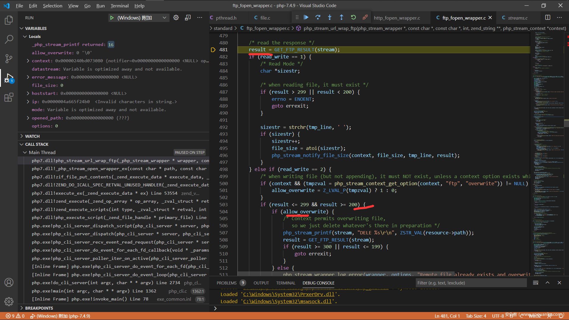 现在来分析一下php的源码吧,调试php的c源码这个应该都没有问题,直接从ftp协议解析的地方开始,我选择的是在window下面附加到php的http服务,下面是index.php的代码